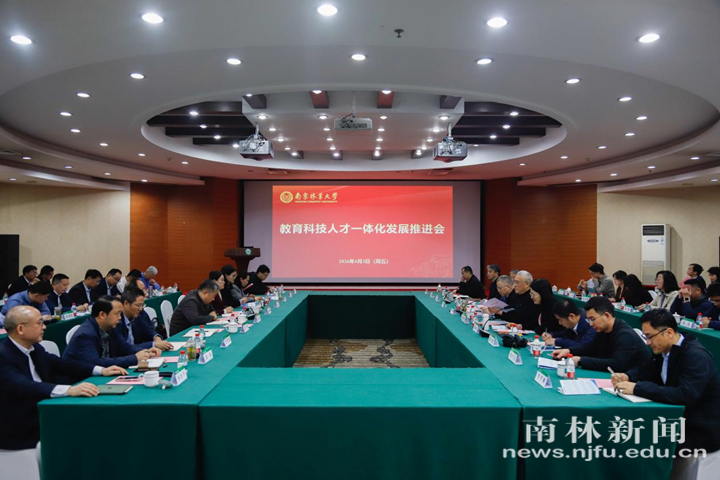 【南林新闻中心讯】为深入贯彻落实教育、科技、人才“三位一体”战略部署,系统谋划年度重点任务,统筹推进“双一流”建设与学校全面高质量发展,4月3日,我校在南林大厦三楼多功能厅召开教育科技人才一体化发展推进会。校长勇强,副校长李维林、尹佟明、张晓琴、赵剑锋、唐金辉出席会议。校长办公室、发展规划与学科建设处、教务处、科技处、人文社科处、研究生院、学生工作部(处)处级干部,国际合作处、人事处、创新创业学院、校团委、教学评估办公室主要负责人,各学院(部、工程中心)院长、主任等参加会议。